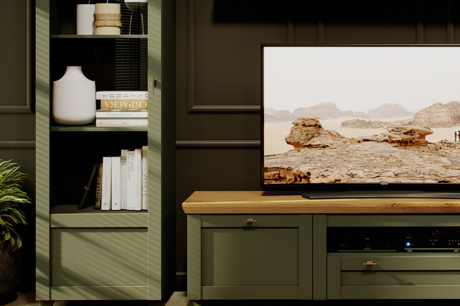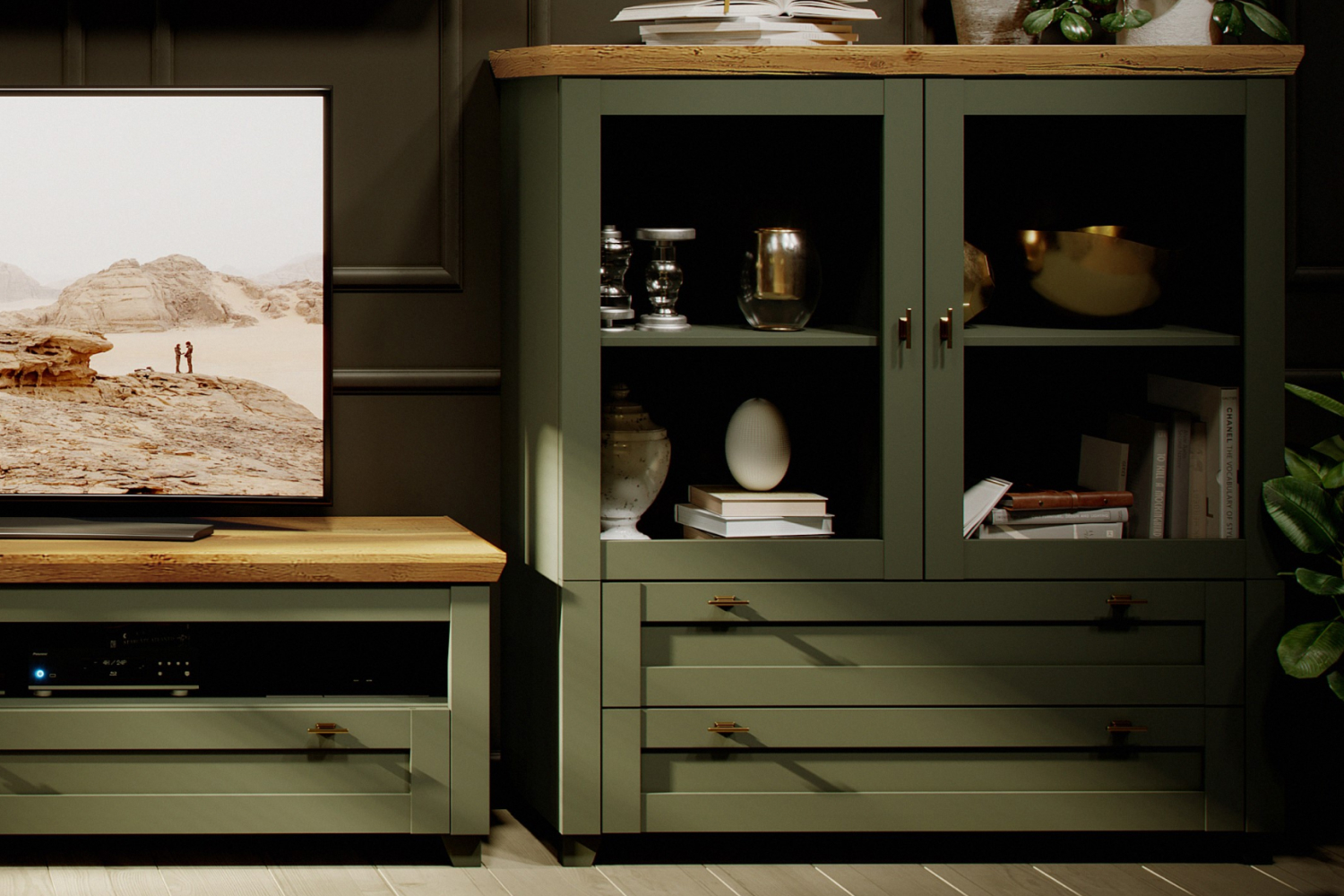 - Шкаф низкий с рамочными фасадами и двумя выдвижными ящиками;