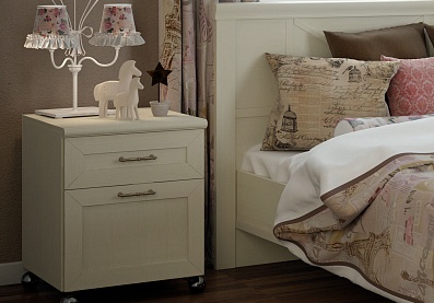 Мебель выполнена из экологичной древесной плиты. Рамочные фасады украшены стильными латунными ручками, отделанными под античную бронзу. Меблировка отличается вместительностью: два высоких шкафа с застекленным верхом, ТВ-тумба и настенные полки позволяют хранить под рукой все необходимые вещи. Бесшумную эксплуатацию обеспечивает система скрытых направляющих со встроенным демпфером и петли с доводчиками. Качественная фурнитура гарантирует надежность крепления.