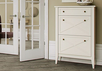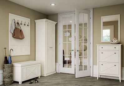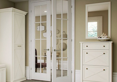 Рамочные фасады, изготовленные из МДФ-профиля и декорированные стеклянными вставками, окрашены в ненавязчивый оттенок «блан шене». На корпусе и на стекле прослеживаются изящные перекрестия фахверков. Дверцы украшены фурнитурой в цвете «античное железо».